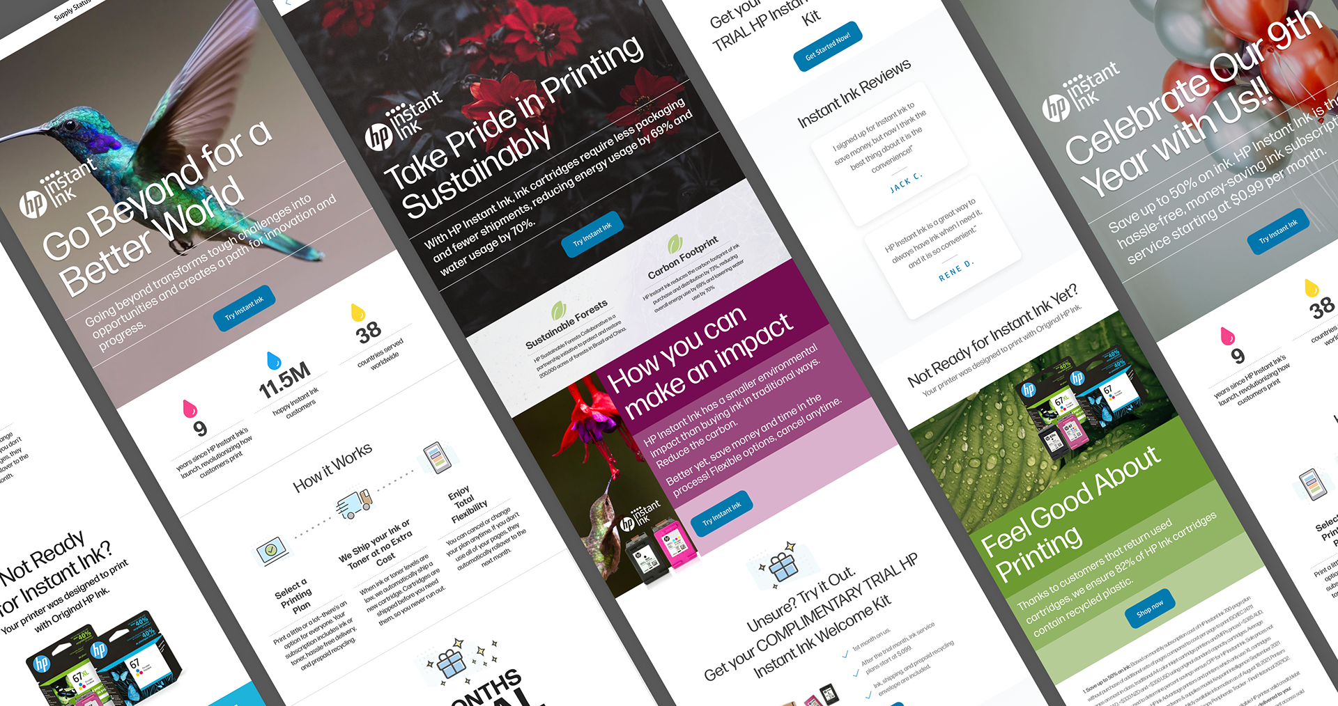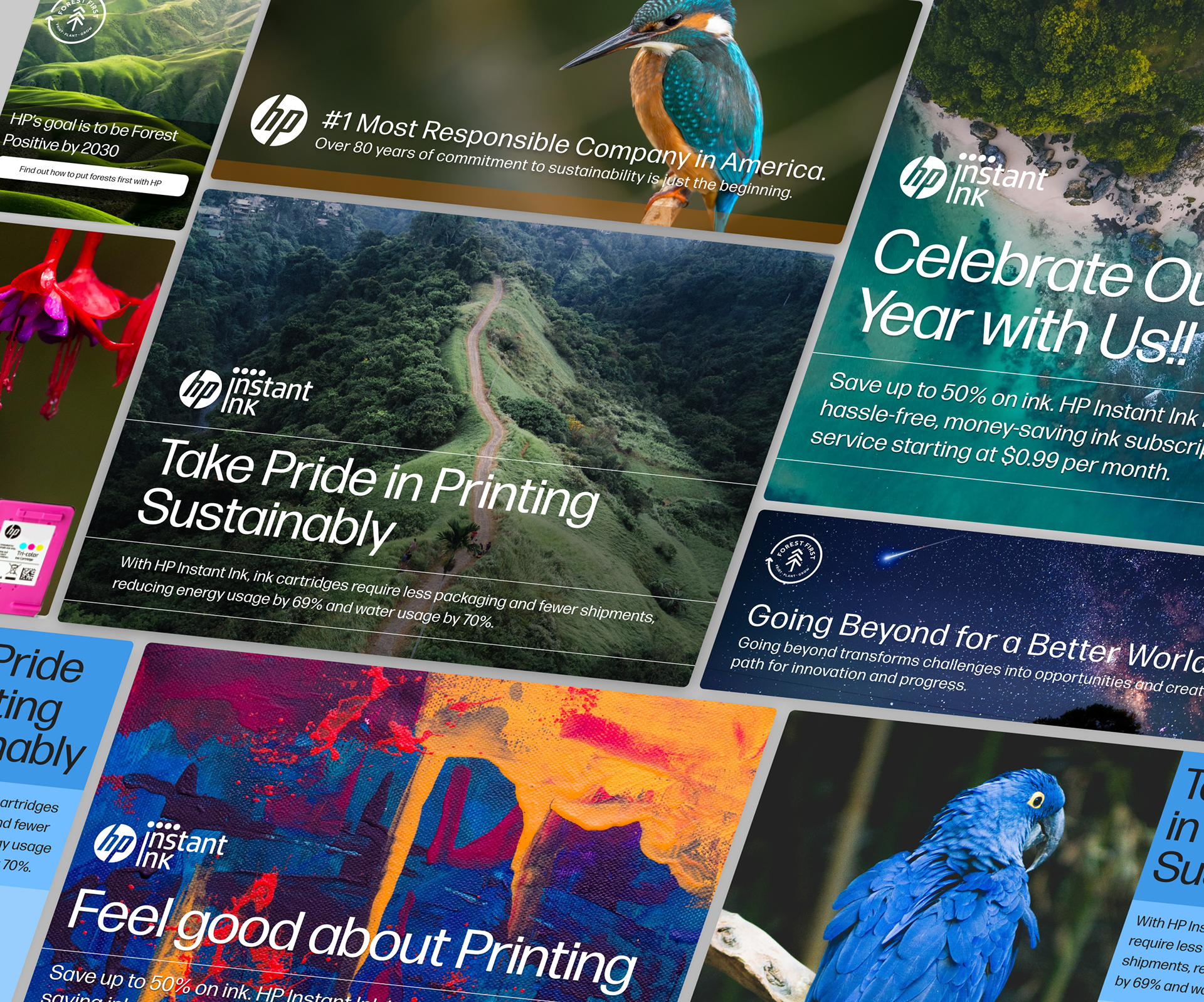 Digital advertisements for Earth Day showcase HP's commitment to sustainability through the Sustainable Impact and Forest First Campaigns. These campaigns go beyond conventional marketing, aiming to make a positive impact on people and communities globally. HP's dedication to environmental responsibility is exemplified through these initiatives, aligning their brand with a greater purpose of fostering a sustainable and eco-friendly future for our planet.